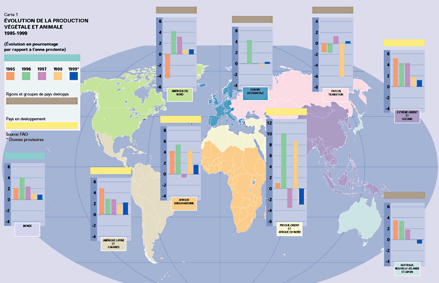 On estime que la production végétale et animale n'a augmenté en 1998 que de 1,1 pour cent, taux le plus bas depuis 1993. Ces mauvais résultats tiennent dans une large mesure à la baisse enregistrée dans les pays développés, qui est estimée 1 pour cent. Mais les résultats globaux des pays en développement ne sont pas non plus très réjouissants: leur production agricole n'a augmenté que de 2,6 pour cent, soit encore moins que les 2,9 pour cent de 1997; on notera toutefois que ces deux années de croissance modeste font suite à une succession d'années beaucoup plus favorables: entre 1993 et 1996, les taux de croissance avaient été de l'ordre de 4 à 5 pour cent.
