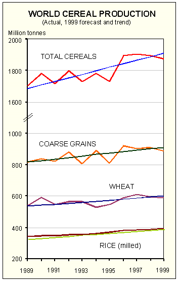 FAO's latest forecast puts world cereal production in 1999 at 1 872 million tonnes (including rice in milled equivalent), 6 million tonnes above the previous estimate in November. The latest increase reflects upward adjustments for wheat and rice, which more than offset a minor downward revision for coarse grains. At the forecast level, world cereal production would be 1.2 percent below the estimate for 1998, but above the average of the past five years. World wheat production is now forecast at 589 million tonnes, 3 million tonnes up from November. The latest adjustment reflects revisions to estimates of some of the later harvests around the globe, including Argentina and Australia. However, also in the northern hemisphere where harvests are normally concluded sooner, a major upward revision has been made to Kazakhstan's output following an exceptionally long harvest period made possible by the late onset of winter weather. The latest forecast of coarse grains production is 886 million tonnes, about 2 million tonnes down from the previous forecast, mostly reflecting downward revisions for some countries in Asia, Africa and South America. At the latest forecast level, global output of coarse grains in 1999 would be 25 million tonnes, or 2.7 percent below the estimate for the 1998 crop. Smaller harvests have been gathered throughout all regions of the globe with the exception of Central America, where production is forecast to remain unchanged, and in Europe, where a marginal increase is estimated. Harvesting of the 1999/2000 main-season paddy crops is virtually complete in the northern hemisphere and planting of the second-season crops is proceeding in some of these countries. Growing conditions have been generally favourable, although floods towards the end of 1999 caused some localized crop damage . Based on latest estimates of the southern hemisphere crops harvested early in 1999, and expectations of bumper harvests in several countries in the northern hemisphere, global paddy output in 1999 is provisionally forecast to reach a record 593 million tonnes, 11 million tonnes up from the previous year's crop.