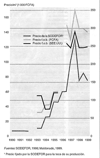Dado que SODEFOR controla más del 90 por ciento de los recursos de teca, las empresas explotadoras y los exporta-dores se ven obligados a tratar con esa sociedad. La situación es totalmente nueva: anteriormente, las empresas madereras pagaban al Estado un precio fijo por la explotación de los recursos de madera. Hoy en día, compran la madera en pie y su precio fluctúa en función del mercado. La nueva función comercial de la empresa estatal es contraria a los intereses de la industria, que desearían que SODEFOR se limitara a la producción. El deseo de esta sociedad de reglamentar y controlar la ordenación ha llevado a clasificar todas las plantaciones como reservas forestales.