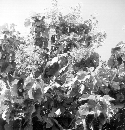 Tectona grandis is a large deciduous tree with a rounded crown and, under favourable conditions, a tall clean cylindrical bole of more than 25 m. The base of the tree is often buttressed (having outgrowths at the base caused by exaggerated root swelling) and sometimes fluted (having irregular involutions and swellings in the bole). Leaves are broadly elliptical or obovate and usually 30 to 60 cm long. Over most of its range, teak occurs in moist and dry deciduous forests below 1 000 m elevation and is one of the several species constituting mixed forest stands. It grows best in localities with annual rainfall of 1 250 to 3 750 mm, minimum temperature of 13º to 17ºC and maximum temperature of 39º to 43ºC.