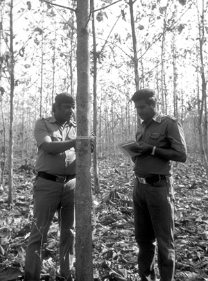 Research work is necessary to verify the viability of teak plantation companies; here, Indian Forest Service officers measure six-year-old teak trees in a plantation survey