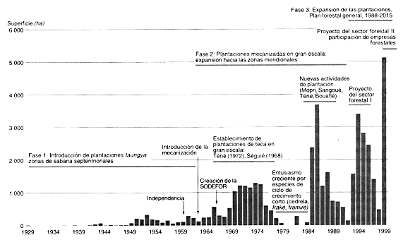 FIGURA 1: Evolución de la plantación de teca en Côte d'Ivoire, de 1929 a 1998