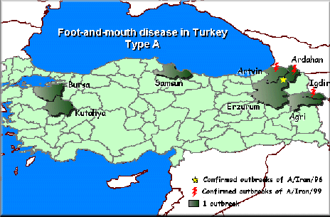 FMD type A outbreaks were reported from Georgia, Iran and Turkey. The WRL has reported that a new type A strain (A/Iran/99) has been identified in Iran. Its characterization by nucleotide sequencing indicated a significant difference in the sequence of the genecoding for the structural protein, VP1, in comparison with previous isolates, including A/Iran/96. The new type A (A/Iran/99) outbreaks in Turkey were located close to the borders with Iran and Georgia and were significantly different from the A/Iran/96 virus which is still causing outbreaks in Turkey and the standard vaccine strain (A Mahmatli) that is used in Turkey. The All-Russian Research Institute for Animal Health (ARRIAH), Vladimir, Russian Federation reported that the A virus responsible for the outbreaks in Georgia was analogous to A/Iran/96.