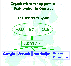 The European Commission for the Control of Foot-and-Mouth Disease and the EC are providing financial support (US$340 000) to ARRIAH for the establishment of a buffer zone in the Caucasian region. Preventive vaccination zones against types O and A were established in 1999 in the Caucasian republics of the Russian Federation and in the districts of Armenia, Azerbaijan and Georgia along the borders with Turkey and Iran. Vaccination against Asia 1 should also be carried out in the spring of 2000. Activities in the region are coordinated under the FAO/EC/OIE tripartite group, as shown in the figure above. (Source: EUFMD.)