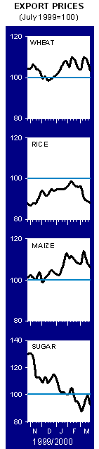 FAO's first forecast of world cereal production in 2000 is 1 890 million tonnes, some 1 percent above 1999. Output of wheat is forecast at 595 million tonnes, 1 percent up from 1999, that of coarse grains at 900 million tonnes, nearly 3 percent up, while the rice crop (milled basis) is tentatively forecast to fall by 1 percent to 395 million tonnes. While early forecasts point to higher cereal production in 2000, output would not be sufficient to meet expected utilization requirements in 2000/01, and global cereal reserves would have to be drawn down. Food emergencies persist in 34 countries throughout the world, and unfavourable prospects in several others could lead to localized supply difficulties (see page 4). FAO's latest forecast of world cereal trade in 1999/2000 is 222 million tonnes, unchanged from the previous report and some 4 percent above the previous year's volume. The increase is attributed to larger imports of both wheat and coarse grains, which would more than offset the likely decline in rice trade. International grain prices have been volatile and slightly higher in recent weeks, reflecting active trade and concern over adverse weather for the 2000 crop in the major producing areas of the United States. Ample new-crop supplies and dull trading pressured international rice prices downward. The FAO Export Price Index for Rice averaged 104 points in March, its lowest level since June 1994. Global cassava production recovered in 1999, resulting in an overall increase in food, feed and industrial utilization. Large export availabilities led to a substantial expansion of trade, but prices fell to their lowest level in the decade. Global milk production is forecast to increase slightly in 2000, but with sustained import demand expected, exportable supplies, especially of milk powder, could be in short supply. As a result, international prices for most dairy products, and especially milk powder, are expected to increase during 2000. |