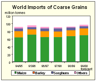 The forecast for world trade in coarse grains in 1999/2000 has been raised by 700 000 tonnes this month to 96.7 million tonnes. At this level, world imports would be over 4 million tonnes, or 5 percent, above those of the previous year. Among the individual coarse grains, maize and barley could expand most, to 70 million tonnes and 17 million tonnes, respectively. An increase in coarse grain imports by the developing countries to almost 63 million tonnes would account for most of the anticipated increase in world trade in 1999/2000. In the developed countries, aggregate imports could reach 34 million tonnes, also up from the previous year.
