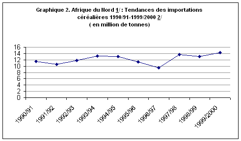 Les productions végétales de la sous-région (à l'exclusion de l'Égypte, où les cultures sont en grande partie irriguées) ont fortement fluctué au cours des dernières années, en raison de sécheresses répétées. Au cours des dix dernières années, la production céréalière globale a varié de 4 à 8 millions de tonnes au cours de cinq années de sécheresse et de 10 à 18 millions de tonnes au cours de cinq bonnes années (voir graphique 1). Les cultures céréalières de 1999 ont également été affectées par la sécheresse et la production est estimée à 8 millions de tonnes, soit 31 pour cent de moins que celle de l'année précédente. Les besoins d'importations céréalières pour la campagne de commercialisation en cours (juillet/juin) se chiffrent donc à environ 14 millions de tonnes, soit 9 pour cent de plus que la campagne précédente. On ne dispose pas encore d'informations précises sur les dégâts provoqués par la sécheresse, mais selon les indications actuelles, la production céréalière globale dans les quatre pays touchés pourrait tomber nettement en dessous de la récolte de l'année dernière, déjà réduite par la sécheresse et s'approcher du volume de 1997, soit de 6 millions de tonnes. Une deuxième année consécutive de mauvaises récoltes dans la sous-région, notamment au Maroc et en Algérie, qui sont les pays les plus touchés, entraînera une augmentation ultérieure des importations céréalières d'où une pression accrue sur les budgets nationaux. En 1999, le déficit de production céréalière, dû à la sécheresse, a été en grande partie couvert en prélevant abondamment sur les stocks. S'il y a un déficit de production en l'an 2000, il faudra donc recourir en grande partie à des importations.