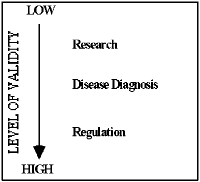 The meaning that will be attributed to results will also depend on the context of the interpretation. Contexts include research, disease diagnostics and regulation of fisheries operations which will require different levels of validity (Fig. 1). In the research context, the required level of validity need not be high provided the technique generates information of use for the formulation or confirmation of models of disease. On the other hand, the use of the technique for diseases diagnosis necessitates a much higher level of validity because of the therapeutic and/or management decisions that may rest on the outcome of the application of that technique. At the highest level of validity, the interpretation of results in a regulatory context may have far-reaching and serious implications for a fish farmer, region or country.