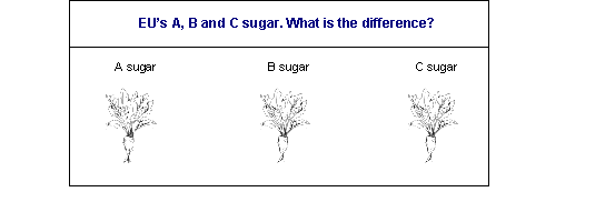 The production quota system was introduced at the beginning of the EU regime, 1st of July 1968, as a counterpart to the relatively high price level, which was established as a compromise between the high prices in the less efficient producer countries and the much lower level in the more efficient areas. Quota allocation: EU member states allocate an "A quota" and a "B quota" to each sugar producing operation, each isoglucose-producing operation and each inulin syrup-producing operation established in their territory. A-sugar is sugar which is produced within the "A quota", i.e. sugar for which producers pay a maximum levy of 2 % of the basic beet price. B-sugar is sugar which is produced within the "B quota", i.e. sugar for which producers pay additional to the a levy of maximum 2 % a levy of 30% of the basic beet price. Hence, the quoted minimum beet price for "B sugar" is 68% of the basic beet price. There is however provision for an additional 7,5% levy on "B" beet, so that the maximum normal production levy on "B" quota sugar is 39,5%. "C-sugar", "C-isoglucose" and "C-inulin syrup" refer to any quantity of sugar, isoglucose or inulin syrup which is produced outside the sum of total A and B quotas. According to EU-legislation, "C sugar" must be sold on the world market without export subsidies or carried over to the following marketing year. To ensure that the "C" production is exported, a time limit is applied. It has to be sold on world markets "before January 1 following the end of the marketing year" in which it was produced. Exception: processors are allowed to carry over a quantity of sugar, up to a maximum equal to 20% of their "A" quota into the following production year. Limited time: In principle, the Communitys beet sugar production quotas are reviewed once every five years. In practice however, the reviews have not kept absolutely to this regular pattern. The sugar regime was introduced 1st July 1968, the first set of quotas applied for 7 years, the second for 6, the third for 5 the fourth for (2+3), the fifth for (2+1+1). The present (sixth) production quota levels apply for six years (1995/1996 to 2000/2001) and are a continuation of those in force since they were last reviewed. It will expire 30.06.2001. Interprofessional agreements One contrasting feature of the sugar regime, for example with the dairy regime, is that the production quotas apply for the processed products. They do not apply for the farm-gate products, as sugar beet and cane are not storeable. Consequently there have to be elaborate provisions to ensure the benefits of the quotas for the processors are passed back to farmers, in terms of their sugar beet supply contracts to fill the quotas. This is done through the requirement for the negotiation of an Interprofessional Agreement in each country between the sugar processors and the recognised representatives of the sugar beet growers (normally a specific beet growers association). Coming back to the question I asked in the introduction: What is the difference between A, B and C sugar? Is the one sweeter than the other? I think one can easily say that yes there is a difference: "A-sugar" is sweeter for the income of European farmers and processors.