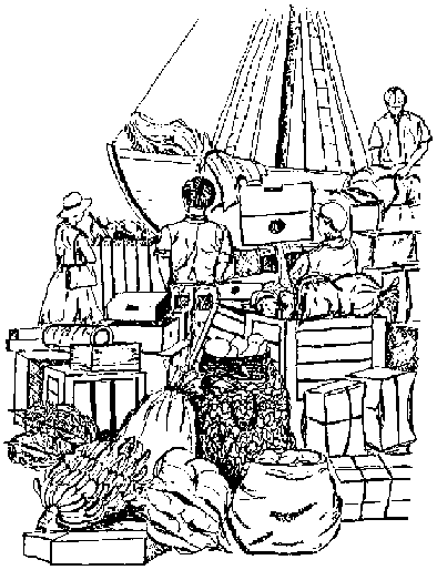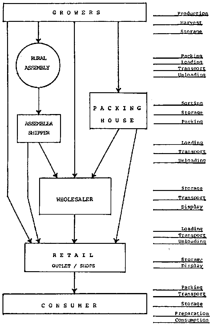 Handling operations are seldom given much thought by the individuals directly involved in moving the process, particularly when the produce is only moved short distances. Figure 6.1 (see Figure 6.1. Handling steps during fresh produce marketing) gives an indication of the number of handling steps that will probably be endured by the produce. Notice that most of them are movements over very short distances and most probably by direct manual handling. These short moves are usually highly repetitive operations and unless the personnel concerned are properly trained and motivated then the physical handling is likely to be very bad leading to produce injury, spoilage and high losses (Witness the loading of inter-island vessels with fresh produce!).