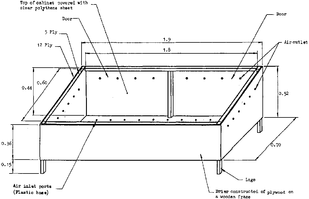 The first of these is of sturdy construction - essentially a glass or plastic topped box with base and sides constructed from wood, plastered earth, brickwork, or other suitable material. The aides and base can be fabricated to give high insulation, and thus the cabinet dryer is particularly suitable for use whore high temperatures are required in the drying process. By restricting the ventilation of the cabinet, temperatures as high as 80 C have been obtained in work carried out in Barbados by the Brace Institute (Lawand 1966).