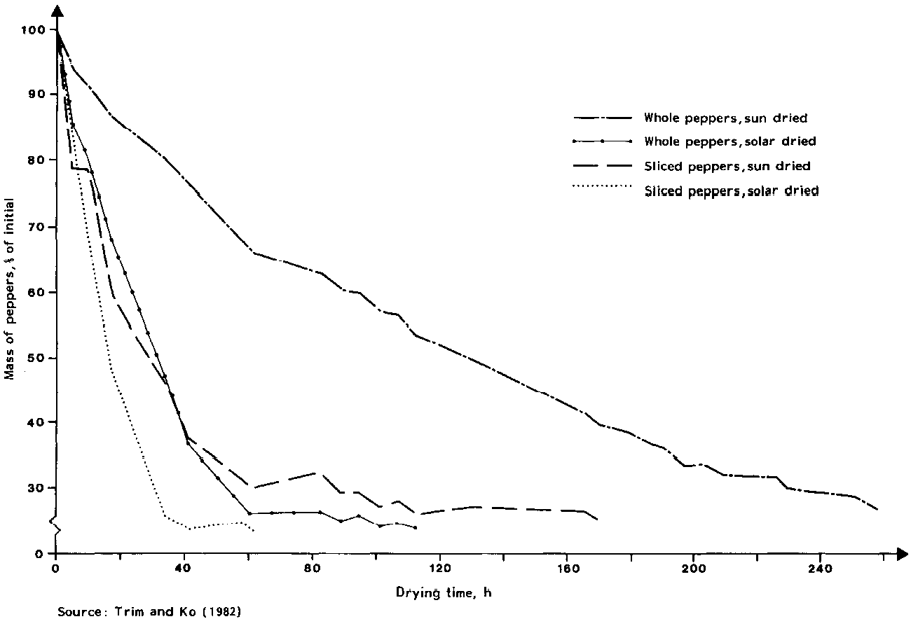 Comparative trials have been made of solar drying and the traditional sun-drying process. The results of one of these are shown in Figure 6 (see Figure 6 - Comparison of efficiency of solar drying and traditional sun-drying of red pepper). These demonstrate that for whole peppers the solar drying process is more rapid' and capable of yielding a product of lower moisture content' than the sun-drying process. Organoleptic tests and laboratory assessments of colour and capsicin content (an index of pungency) have revealed no significant difference between the products.