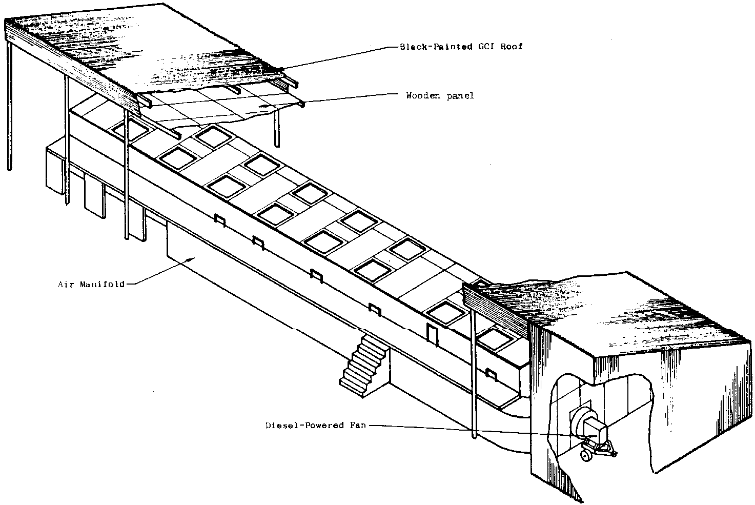 The design of the drier is shown in Figure 7 (see Figure 7 - TDRI Parchment Coffee Drying System). The drying bins are contained in a building of which the roof forms a simple "bare plate" solar collector black painted corrugated iron with a hardboard ceiling suspended 30 cm beneath it. Air is drawn through the cavity between the roof and ceiling by means of a diesel-powered fan' the air being drawn also around the diesel engine block before entering the fan and being propelled into the drying bins. Temperature increases of up to 15 C have been obtained by passage of air at 8.5 m³/s across the roof cavity, with an additional 3-4°C increase derived from the waste heat of the engine.