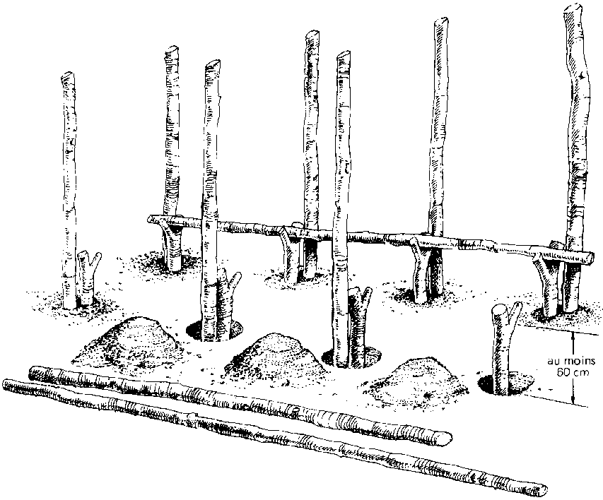 Enfoncez un poteau en forme de 'Y' dans chacun des 8 trous À l'éxterieur de chaque poteau placez un montant vertical, les plus courts d'un côté, les plus longs de l'autre. Remplissez de terre et tassez.