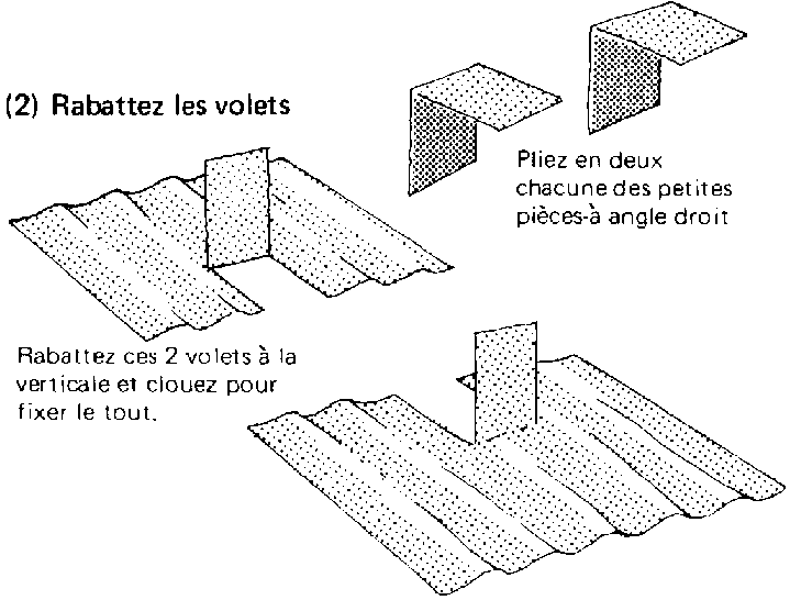 Que votre toit soit en chaume ou en tôles, il importe qu'il fasse saillie tout autour d'au moins 30 cm. Un toit à une seule pente sera incliné de telle sorte que l'avant soit placé à 15 cm au dessus de l'arrière. Si le toit a deux pentes, le faîtage sera situé 15 cm au dessus des bandes d'égout.