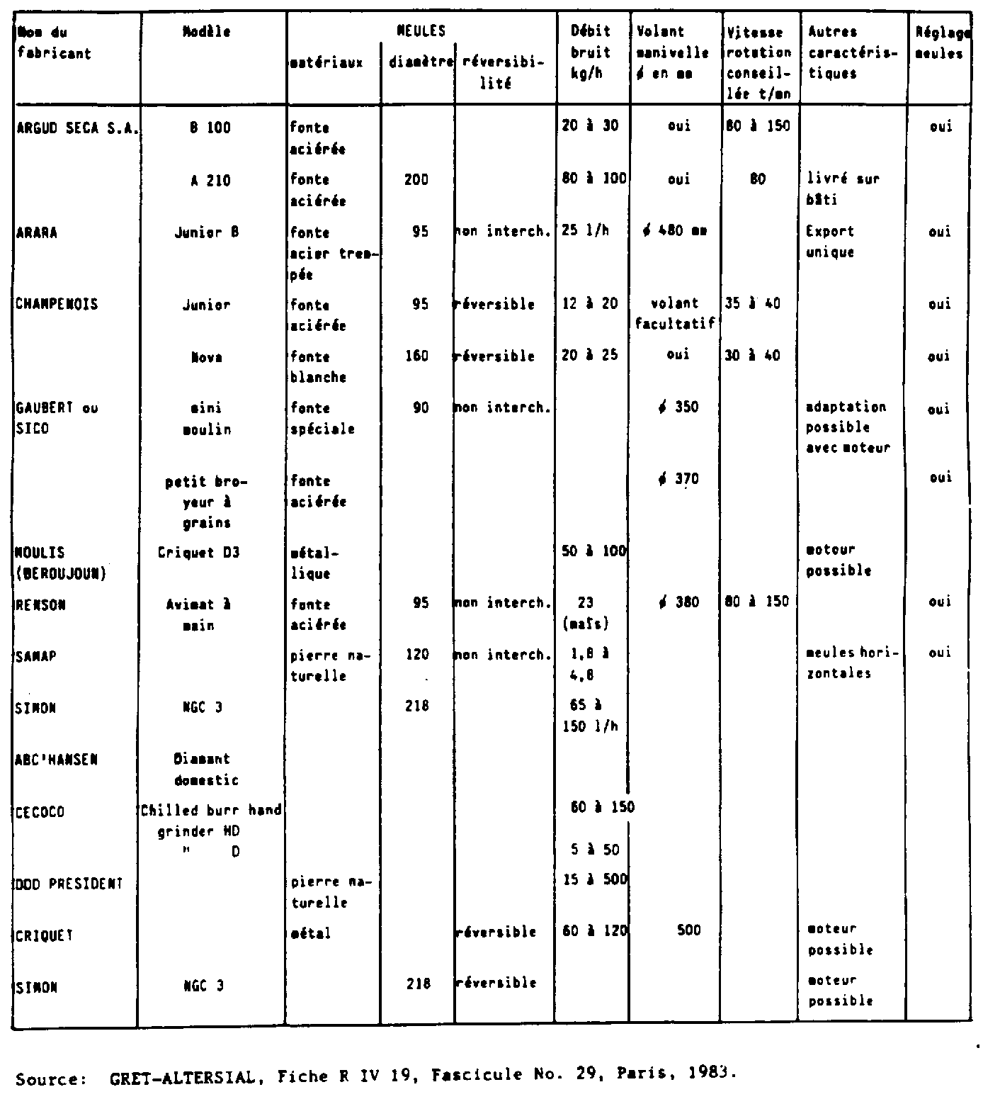 Actuellement, tous les moulins à meules sont importés. Une fabrication locale de moulins à meules est envisagée dans le cadre de la diffusion de moulins à manège (cf 1.3. ci-dessous). Une liste de moulins à meules actuellement disponibles et de leurs constructeurs se trouve à l'Annexe III.