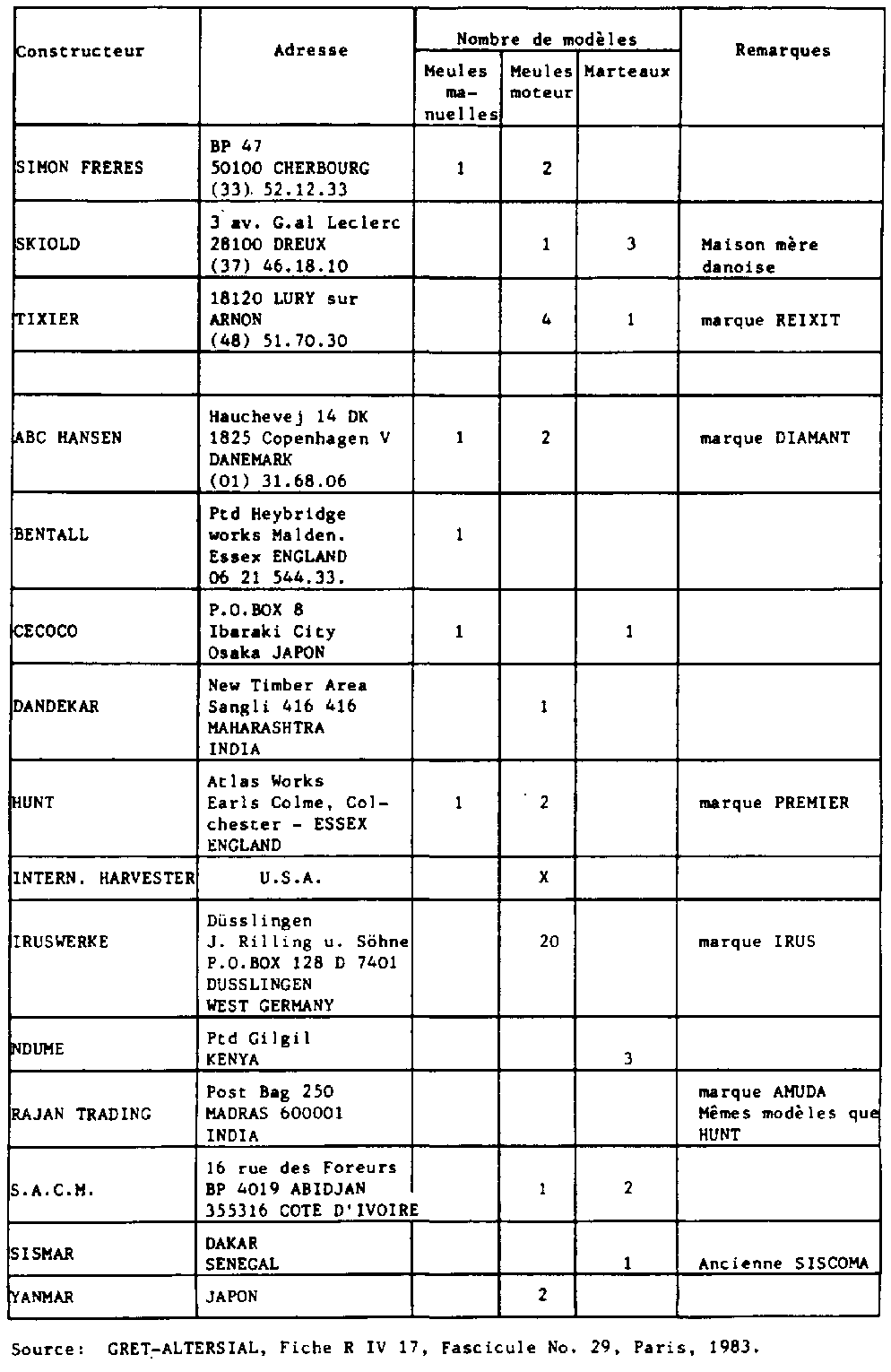 1.1.8 La plupart des broyeurs à marteaux sont importés; (cf Annexe II pour une liste du matériel existant). Des broyeurs à marteaux fixes sont à l'heure actuelle entièrement fabriqués au Sénégal dans des ateliers artisanaux équipés de postes de soudure, Souvent les artisans sont plus disponibles que le personnel des firmes d'importation et peuvent consacrer plus de temps à la formation des villageois; ils assurent aussi un suivi plus serré des appareils.