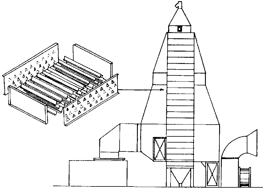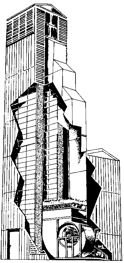 Los secadores de columna, como el que aparece en la figura 41, pueden usarse de dos maneras: i) los granos permanecen sin movimiento, y ii) los granos se recirculan mecánicamente. Este segundo sistema permite una mayor homogeneidad del secado. El producto baja por columnas verticales, compuestas de chapas perforadas, con una capacidad de 0,30 metros de columna de granos.