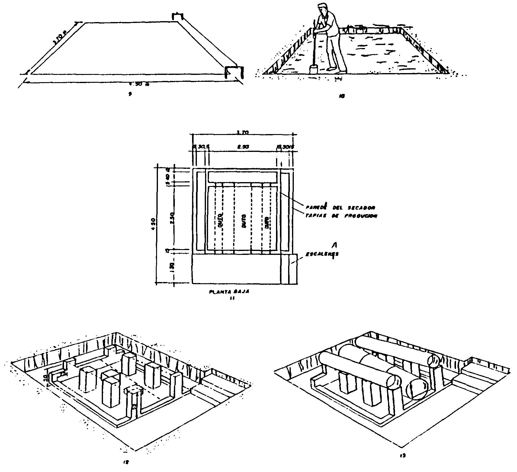Horno. La temperatura del secado se obtiene a través del calentamiento de los barriles metálicos y de las latas que están debajo de la capa del producto. El calor almacenado en el secador se puede utilizar en forma más eficiente realizando varios secados durante el día.