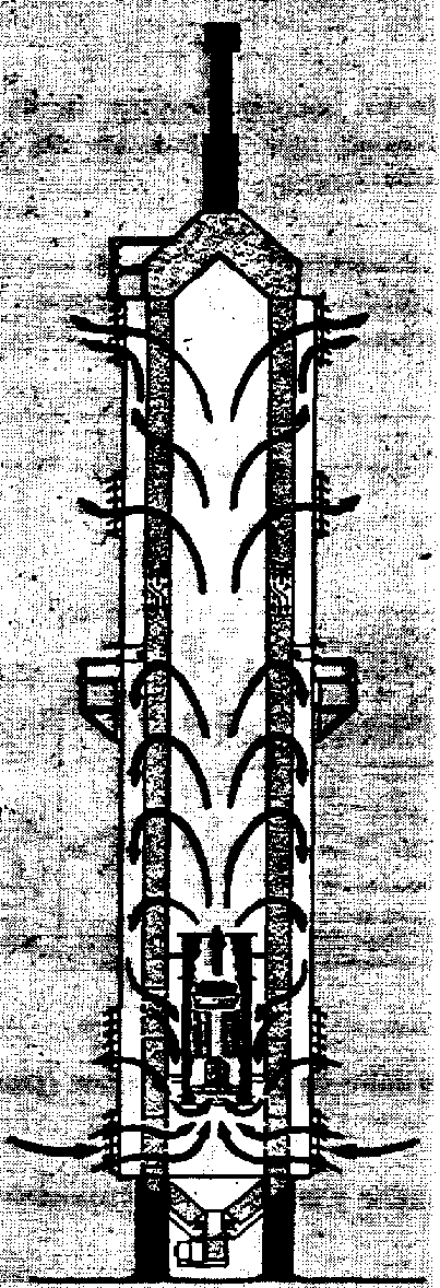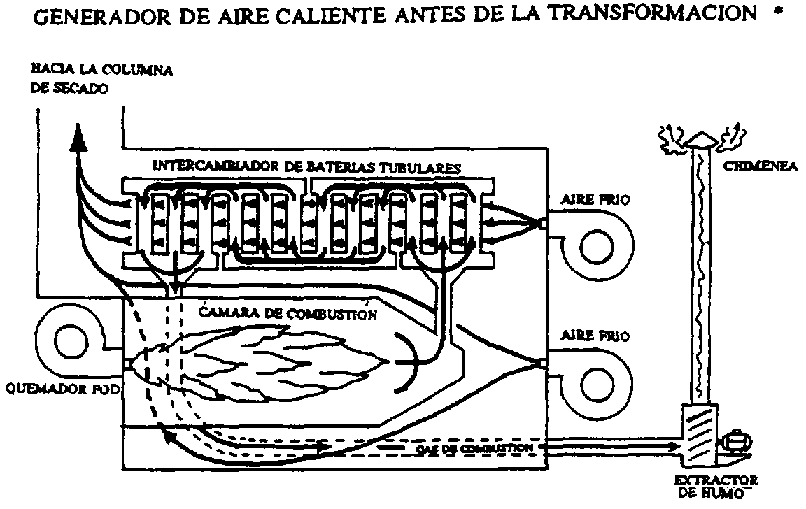 La Figura 25 ilustra un típico intercambiador de calor. La combustión calienta la pared metálica del circuito por radiación de la llama y por convección. El calor atraviesa esta pared por conducción y es transmitido al aire de secado del otro costado de la pared. Este modelo, de tipo anular cilíndrico, es muy simple, pero existen también de tipo tubular; en éstos, el aire de secado se recalienta en una batería de tubos en el interior de los cuales circulan los gases de la combustión. En la Figura 26 se observa un intercambiador de este tino.