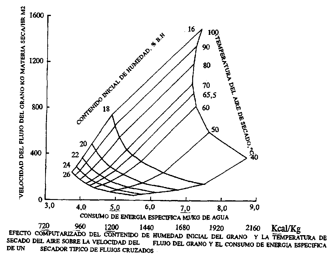 El mismo autor (Nellist, 1986) presenta un interesante gráfico (Figura 30) donde se presenta la influencia que tiene la humedad inicial del grano y la temperatura del aire de secado sobre el consumo específico de energía y la capacidad de secado, para una secadora de flujo cruzado.