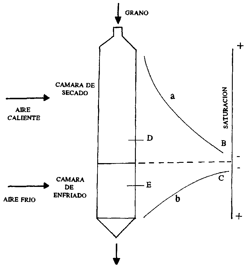 La curva "a" expresa cómo va disminuyendo la saturación del aire a medida que se desciende en la cámara de secado. En la parte superior el aire sale casi saturado, pero al atravesar la parte inferior (punto B), su saturación es muy escasa, pero está caliente. Lo contrario sucede con el aire en la sección de enfriado. En el punto C el aire sale también muy poco saturado, pero caliente igualmente. A medida que atraviesa la parte inferior, sale más saturado y más frío.