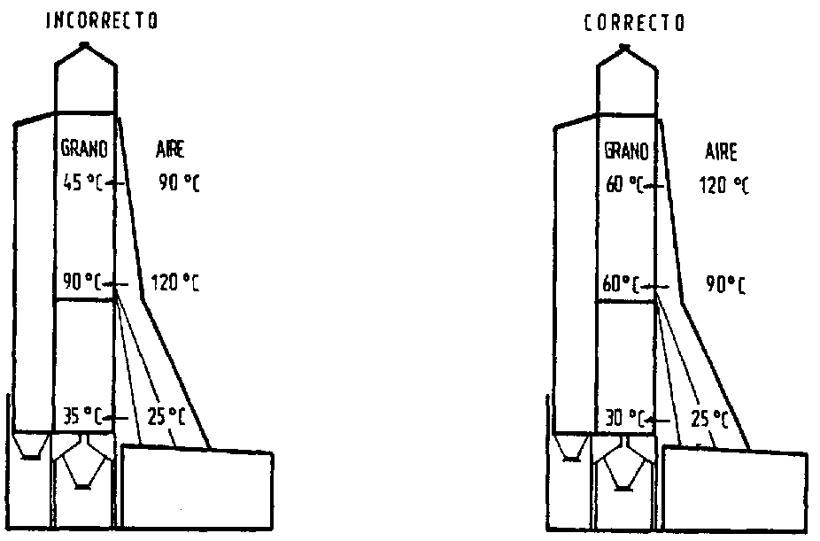 También debe advertirse que en el caso particular de maíz destinado a molienda seca o molienda húmeda, si su humedad inicial es superior a 30%, la temperatura del aire en la parte superior no debiera ser mayor de 100°C. Para otros granos se recomienda leer la parte correspondiente al secado de cada cultivo (Capítulo IX) y también el Capítulo X - 11.