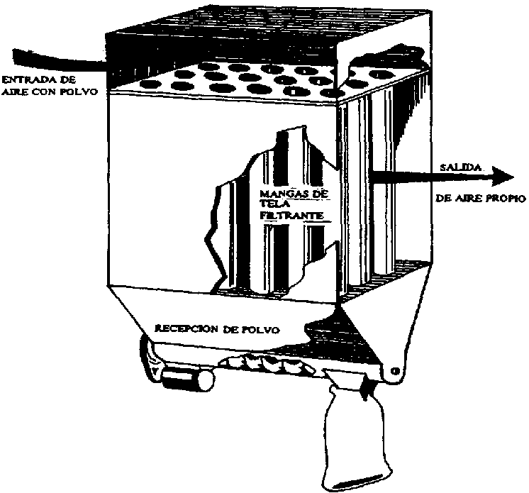 Entrada aire sucio; Salida aire limpio; Mangas de tela filtrante; Recepción del polvo