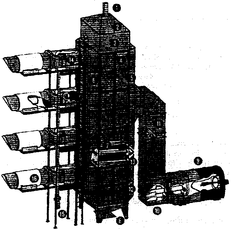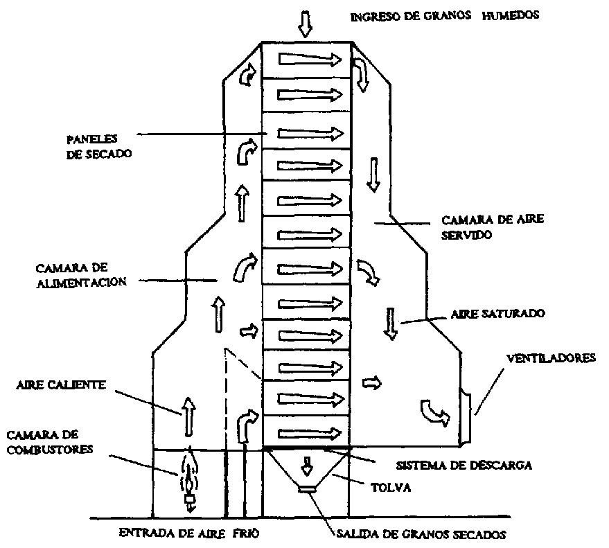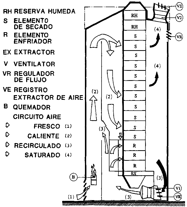 Hay que decir, también, que existen secadoras que tienen varios quemadores a distintas alturas de la torre de secado, y que cada uno suministra una temperatura determinada y uniforme, que van descendiendo desde arriba hacia abajo (Figura 37), situación que favorece una mejor eficiencia de la máquina.