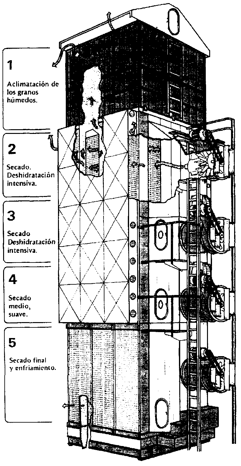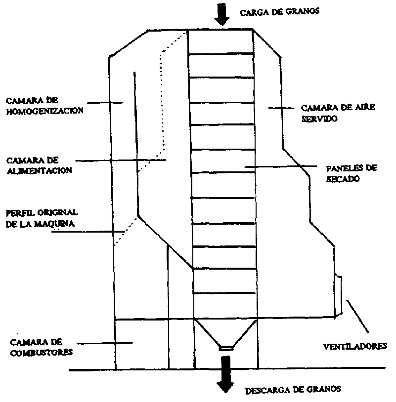 Algunos modelos de secadoras, por particularidad de un diseño moderno, tienen muy escasas pérdidas por radiación o convección hacia el exterior. En la Figura 41 se observa una secadora de columnas, cayos generadores de calor y ventiladores se encuentran dentro de la máquina, de manera que las corrientes de aire caliente no están rozando paredes en contacto con el aire exterior.