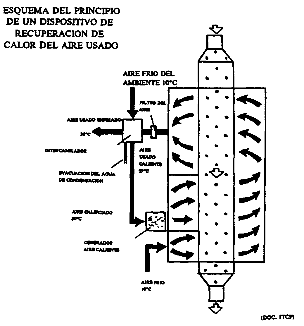 El otro sistema utiliza un intercambiador, ubicado antes del generador de aire caliente, donde el aire usado caliente a unos 50°C sirve para calentar el aire frío exterior (Figura 40). Es posible elevar así unos 20°C la temperatura del aire exterior.