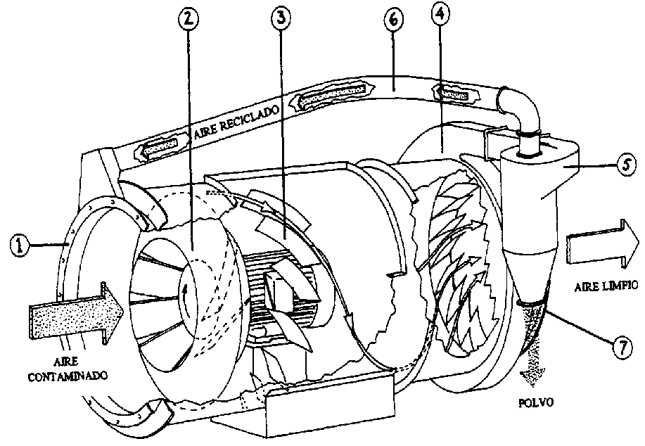La fuerza centrífuga originada por esta fuerte rotación impulsa las partículas de polvo hacia la periferia del equipo, separándolas de la corriente principal de aire. Las partículas separadas de polvo pasan por un separador espiral (4) y después a un pequeño ciclón (5). En este último el polvo es separado de un poco de aire secundario que resta, aire que a través de un conducto de recirculación (6) vuelve a la boca de entrada.