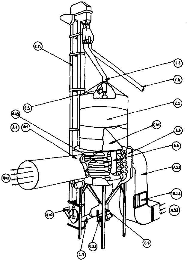 A.2 y B. 1: ventilador; A.3: cámara de aire caliente; A.3.1: conducto de aire caliente; A.3.2: entrada de aire; A.4.3: cámara de secado; B.2.2: compuerta reguladora de aire; B.4.1: salida de aire usado; C.1: entrada de granos; C.1.1: encausador de grano; C.2: depósito de granos en reposo; C.3. 1: accionamiento del regulador; C.5: distribuidor; C.6: salida del grano; C.8: descarga del grano seco; C.9: conducto alimentador del elevador; C. 10: carga de granos húmedos; C. 11: elevador de carga, recirculación y descarga de granos.