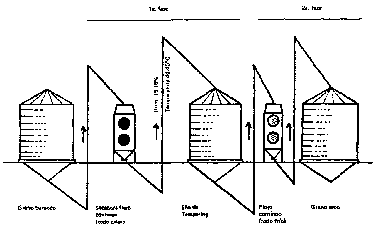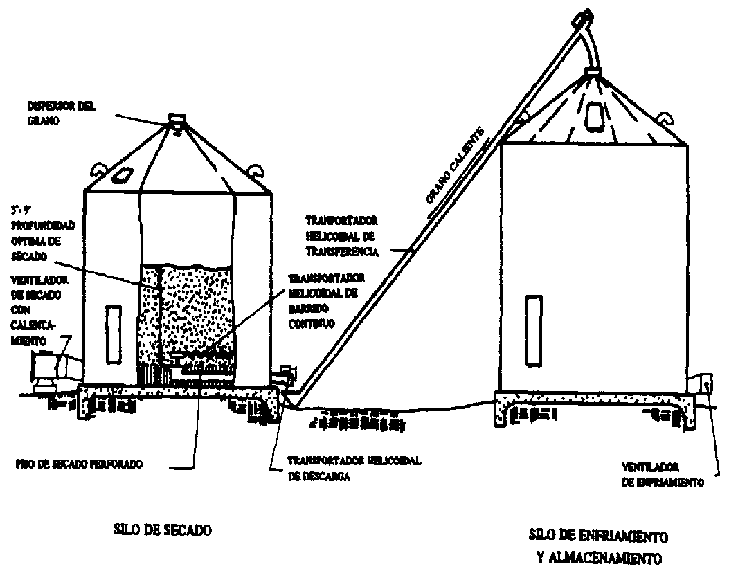 Consiste de dos silos, uno de los cuales es un silo-secador con aire caliente por contracorriente. El grano se carga en el primer silo y es secado hasta que una capa de 10 cm de grano en el fondo haya alcanzado un contenido de humedad de 16,5 - 18,5%. Este grano caliente y parcialmente seco es removido del fondo con una rosca barredora y es transferido al segundo silo donde tiene lugar el secado final y el enfriamiento. Posteriormente ingresa otra capa de 10 cm. (Figura 59).