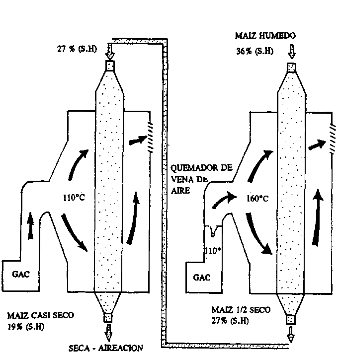 Es evidente que este último procedimiento se adapta más a secadas con alto porcentaje de humedad inicial. La ilustración de la Figura 58 muestra dos secadoras trabajando en serie en una cooperativa francesa, equipadas con quemadores a gas, con dos temperaturas diferenciales y seca-aeración (M. Blin, 1979).