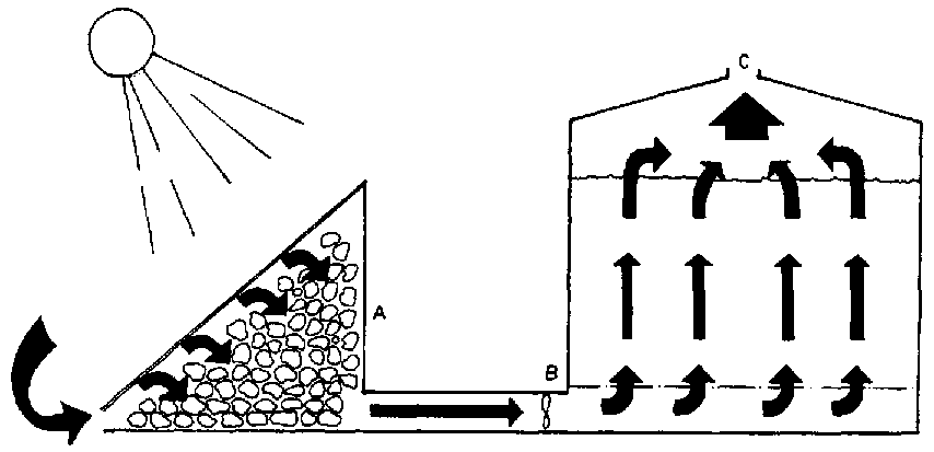 En la Figura 60 se ilustra esquemáticamente una secadora solar. En A se indica un colector solar, formado en este caso por piedras amontonadas en una caja cuyas paredes inferior y lateral son negras. El aire penetra por la parte inferior, atraviesa las piedras calentadas por el sol, se calienta a su vez, e ingresa al silo de grano por la parte inferior, auxiliado por un ventilador B para secar los granos, y sale por la abertura superior C.