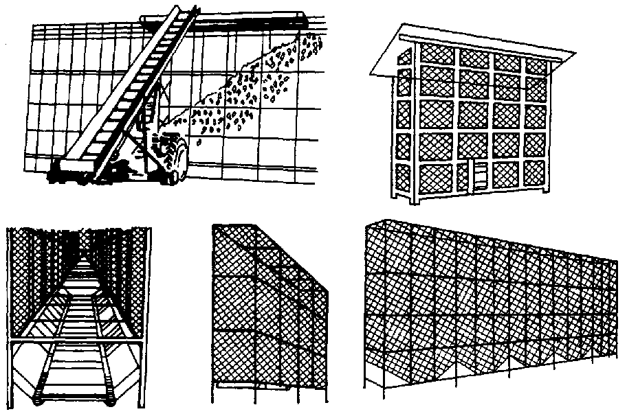 El piso está algo elevado del suelo, para evitar el contacto con la tierra. Todas las paredes y el piso son de alambre tejido y tienen un techo protector, ya sea de material o de atados de paja.