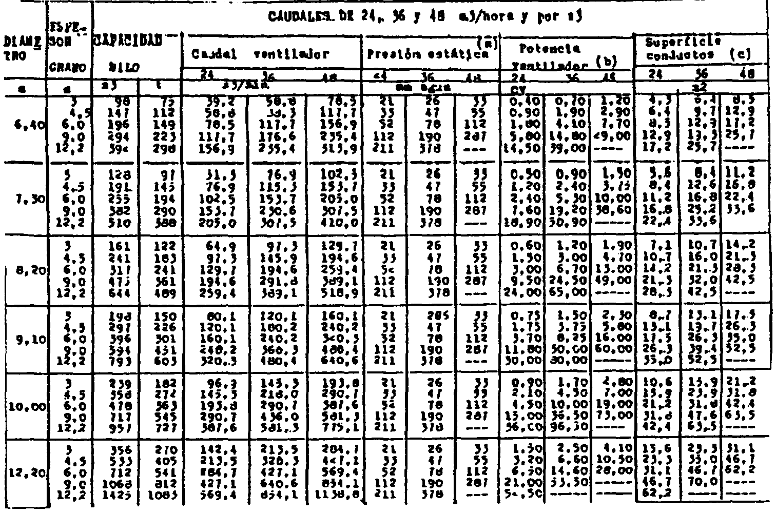 El Cuadro 11 muestra los datos más importantes para la elección y diseño de los silos de seca-aireación, tomando como base el maíz. Se establecen los distintos tamaños de silos, sus capacidades y las alturas respectivas de grano. Para tres diferentes caudales unitarios de aire, se fijan los valores de caudales totales, presiones estáticas, potencias requeridas, y superficies necesarias de conductos para el aire.
