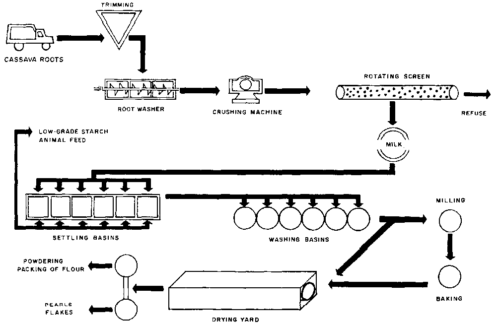 Cassava processing can perhaps best be outlined in the form of the layouts of or other data on existing factories belonging to each of the three production levels (small, medium, and large) which have been taken as a basis for classification.