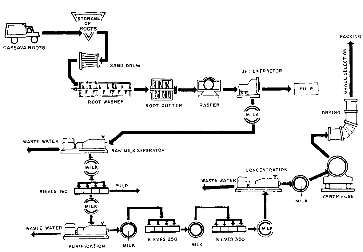 A limited quantity of the cassava imported into Europe in the form of chips and dried sliced roots is manufactured into starch. The dried roots are cleaned, washed and grated and the starch is separated by cylindrical sieves; however, this practice is costly and the starch produced is of inferior quality for the following reasons: