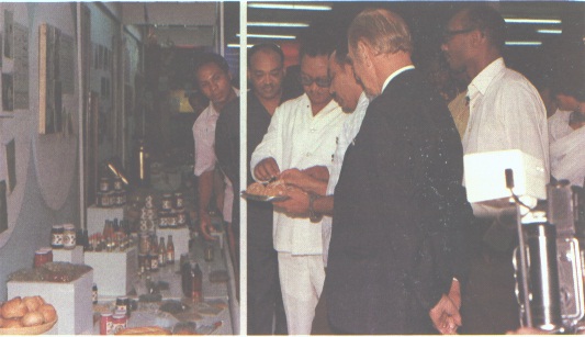 Figure 1 L'ancien Président du Soudan, Mr Nemeyri, goutant du pain du sorgho lors d'une exposition sur l'alimentation à Khartoum, Soudan. (Photo: Mr. H. Perten).