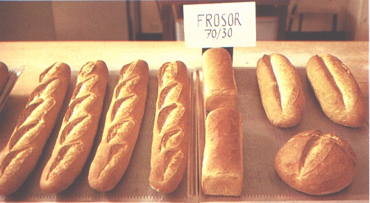 Figure 27. Pains contenant du blé et du mil réalisés à la boulangerie expérimentale de l'ITA , Dakar Sénégal.De gauch à droite: ble 100%; ble 90% et mil 10%; ble 80% et mil 20%; ble 70% et mil 30%; ble 60% et mil 40% . (Photo: Mr. H. Perten).