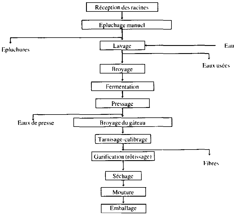 115. L'opération la plus difficile à réaliser industriellement est l'épluchage des racines de manioc; la technique d'épluchage appliquée à la chaîne de fabrication Bertin ne donne pas entière satisfaction, car elle engendre des pertes de matière première de 30 p. 100. En fait, aucun pays n'a encore réussi à mettre au point un procédé industriel d'épluchage de racines de manioc donnant satisfaction au plan économique; la technologie développée au Brésil ne peut être appliquée qu'aux variétés de manioc brésiliennes, à tel point qu'une usine de gari. montée au Nigeria par un constructeur brésilien est contrainte d'éplucher les racines de manioc à la main.
