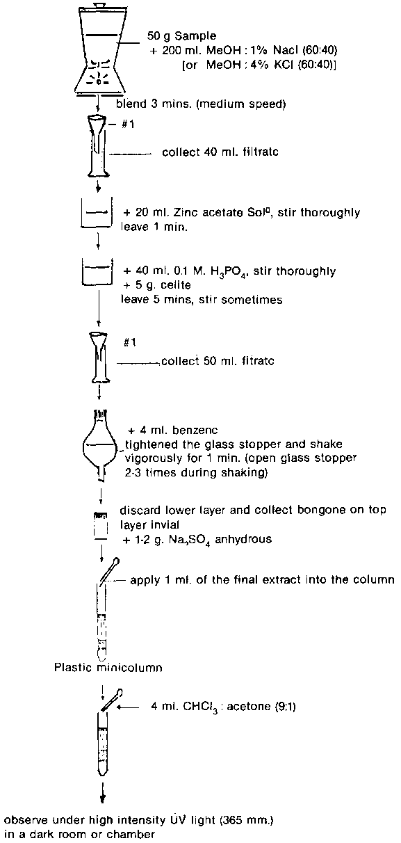 Any of the methods that use a Velasco column or a modification of it can be completed in less time if a small vacuum is used to drain the sample extract and elusion solvent through the column. In fact, since the Holaday columns are packed using paper pulp on both ends to hold the absorbents in place, a vacuum is essential to complete the method in fess then an hour. However, if too strong a vacuum is used, the solutions placed on the minicolumn will travel through the absorbents fast enough to cause interferences and/or aflatoxin to spread over the absorbents. As the aflatoxin spreads over more of the florisil layer, the bluish fluorescence becomes dimmer and dimmer until finally a band, which would be very intense if no vacuum were used, will not be detectable. If interferences on the alumnina or silica gel layers spread sufficiently to reach the florisil layer, they will cover any aflatoxin present. This, also, tends to dim the fluorescent intensity of the aflatoxin band. A vacuum should be used that drains a solution through the minicolumn no faster than 1.0 ml/min to ensure that spreading of the aflatoxin or interferring bands will not take place.