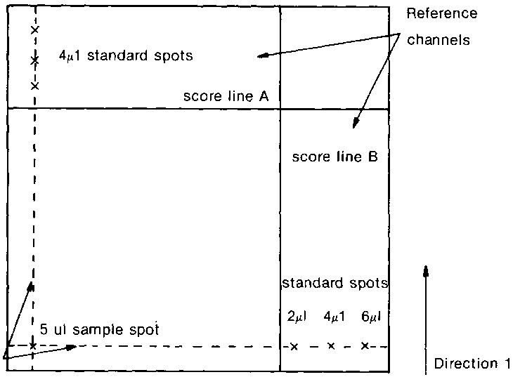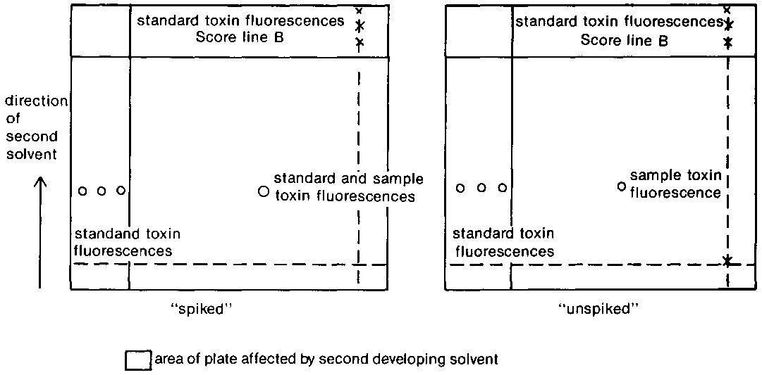 It can be seen that the Rf values of the toxin fluorescence in the "sample" and "spiked-sample" do not correspond exactly to the standard Rf values in the reference channels but are slightly further advanced in direction (2) towards the right of the plate. This is because the coated surface of the plate within the score lines A and B is deactivated by the first developing solvent prior to the second development whereas the coating in the reference channels is not affected. Obviously these differences will depend on solvent systems and coating material used.