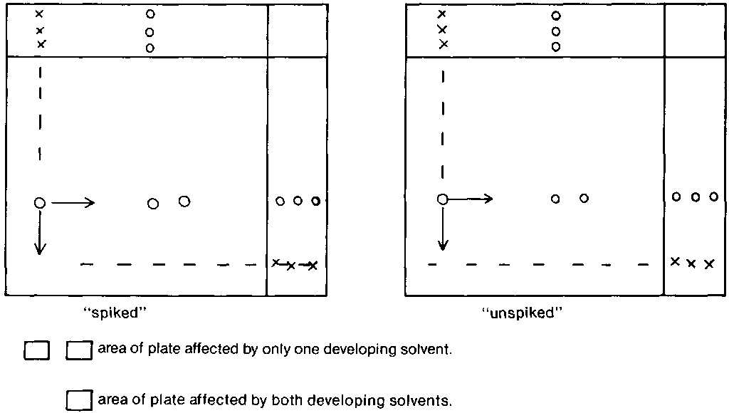 Standards are applied to the plate on the pencil lines in the reference channels and the sample is applied at the junction of these two lines (see diagram above). This means that the sample is in line with the standard when the plate is developed in both directions. Only one sample can be assessed at a time. The same solvent system can be used in both directions, or two different systems can be used. Another plate is scored and spotted, identical to that just spotted, with the exception that an extra 5 ul of standard solution is applied on top of the sample spot, which acts as an internal marker for the toxin on this so-called "spiked" plate. The former "unspiked" plate is developed in the same tank as the "spiked" plate, so that the development conditions are exactly the same for both plates. The plates are placed in the tanks such that their coated surfaces face towards the centre, but do not touch. The solvent is allowed to rise up the plate until score line A is reached. The plate is removed and thoroughly dried in the dark (no solvent residue should remain).