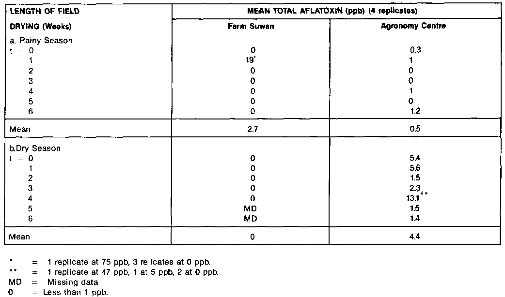 There was no trend towards an increase in levels of aflatoxin contamination with increasing lengths of fielddrying at either location during the dry season trials, see Table 1. At the Agronomy Centre 50% of the samples contained detectable levels of aflatoxin, but the overall mean was still only 5ppb. Field-drying was studied over a 4 week period, instead of over 6 weeks, at Farm Suwan. No aflatoxin was detected in any of the samples from this location.