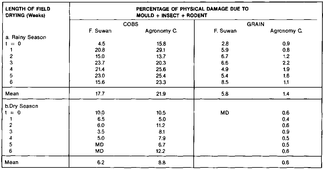 There was no discernable trend towards an increase in either damaged cobs or damaged grains as length of field-drying was increased up to 6 weeks. At Farm Suwan there appeared to be a dramatic increase in damage during the first week, both in terms of damaged cobs and grain, see Table 2. The percentage of damaged cobs increased from 4.5% to 20.8%, and the percentage of damaged grains increased from 2.8 to 5.9%. As field-drying time increased the percentage of damaged cobs and grains oscillated about the mean and did not trend upwards. There was no corresponding increase in damage during the first week of field-dryintg at the Agronomy Centre. The initial increase in damage at Farm Suwan remains unexplained, but could have been due to some unrecorded environmental factor.