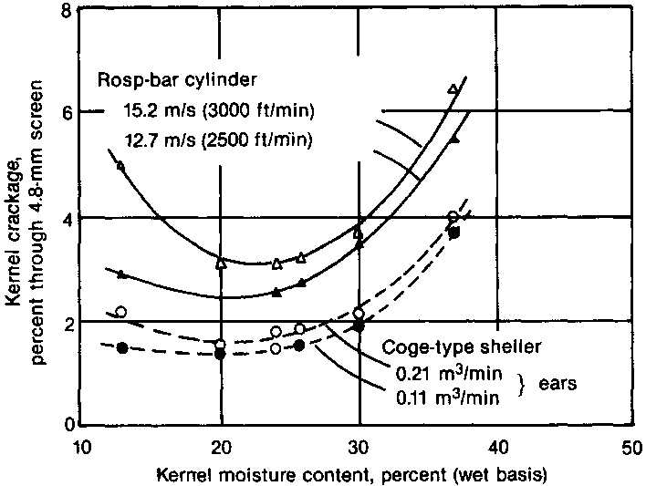 Damage from a rasp-bar cylinder increases with peripheral speed, especially at speed above 15.2 m/s. 11.12 Laboratory studies have indicated that damage is considerably less when the ears are fed into the cylinder with their axes parallel to the cylinder axis, rather than longitudinally or In random orientation.13 Kernel moisture content has a significant effect on damage from either a combine cylinder or a cage-type sheller. Results from various studies 13,44 indicate that crackage increases as the moisture content is changed in either direction from a minimum crackage zone of about 20 to 22% (Fig. 14 Effect of kernel moisture content upon grain crackage from two types of shelling units, as determined with a 4.8-mm (12164-in.) screen.).
