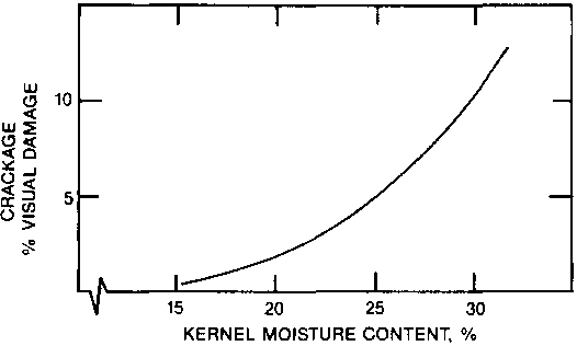 The influence of moisture content on crackage are shown in Fig.13 and 15 (see Fig. 15 Effect of kernel moisture on the percentage of kernels cracked by the sheller.). 10,16 In all cases, crackage significantly increased as kernel moisture increased.